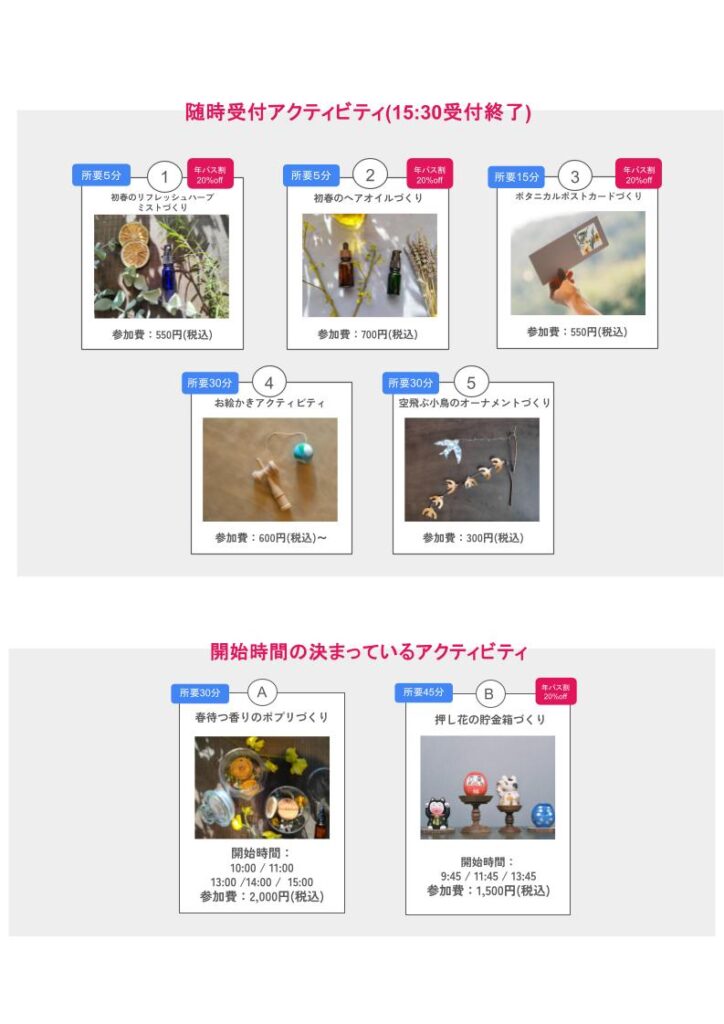 アクティビティも、来る春を感じられるものを多数ご用意しました。