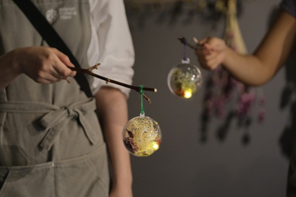 ライト、ドライフラワー、きらきらビーズ、羽などの材料を園内をめぐりながら集めて、オーナメントボールに入れてつくります!園内で持ち歩いてイルミネーションに参加しよう!