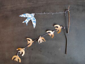 鳥の型に沿って紙を切り、自由にペンで模様付け。