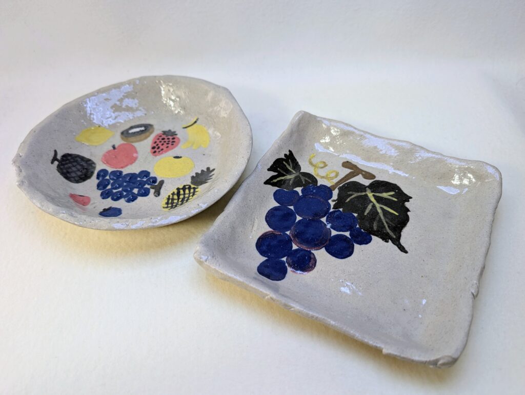 選んだ紙型を使い自分で粘土を伸ばしてお皿を制作してもらい、出来上がったそのお皿に色を付けた泥粘土を使って、筆で自由に絵を描いたり模様をつけたり自分で絵付けをする事が出来ます。