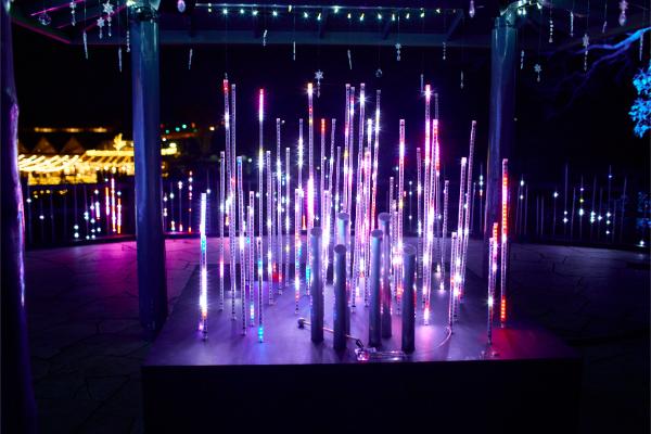 氷の結晶が生まれ、陽に照らされて光を放つ美しさの『氷柱』をイメージしたイルミネーションです。『氷柱』のバーをたたくことで、雪が舞うなかで鐘の音や氷を割るような音と光が織りなす感動的な演出を体験できます。