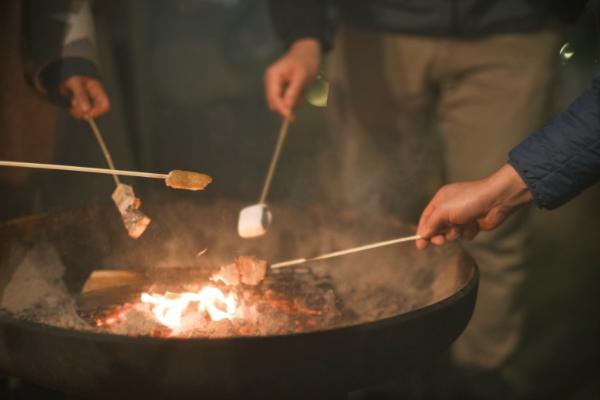 マシュマロや自家製ベーコン、カマンベールチーズに加えて、きりたんぽも登場!焚き火の爆ぜる音に耳を傾けながら、揺らぐ炎に心も体も温まる時間をお過ごしください。