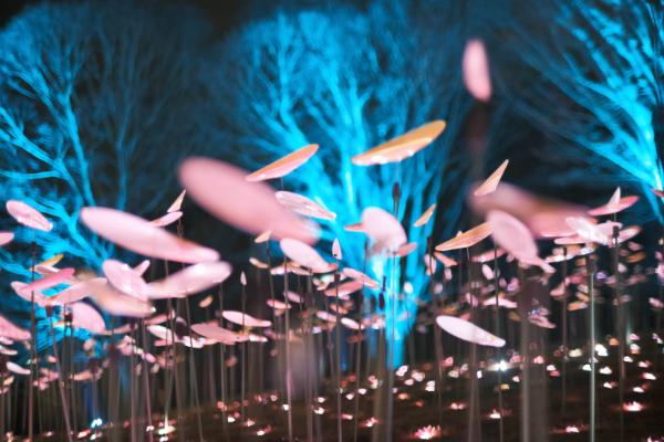 広々とした芝生のグリーンヒルに設置された2000本の風見鶏によりモビールスケープ。風に揺られると、日中は陽の光を受けてキラキラと輝き、夜は幻想的な灯りで園内を彩る。自然の中で風と光が生み出す景色と出会う、小松宏誠氏のインスタレーション「風の花びら」。