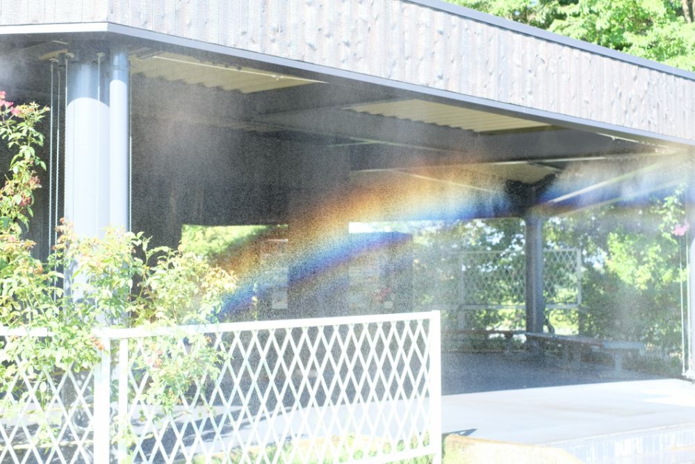 インフォメーション横のパーゴラのミストシャワーでは、虹が出ていました!