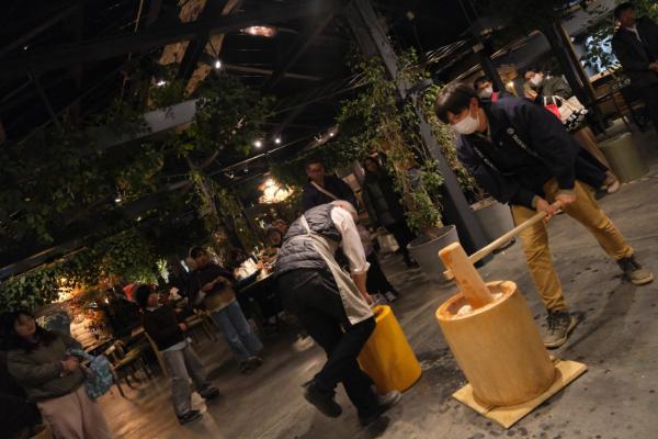 夕方からは、毎年恒例となっているお餅つきが行われました。ふかした八郷米のもち米を臼に入れ、杵で力強くつく様子は迫力満点。掛け声とともにリズムよくつかれる餅つきは、見ているだけでも自然と笑顔になり、日本の伝統文化の温かさを感じさせてくれます。