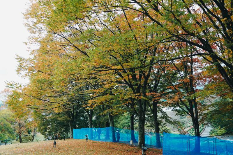 紅葉の木々の下にある2つのドッグラン