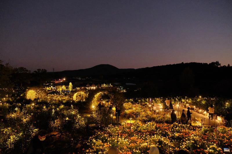 月明かりに浮かびあがる夜のバラ園をお楽しみください。