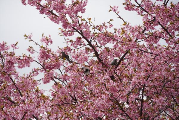 山より遅れて、菜の花満開の池の周りにある河津桜が開花し始めてきました。
