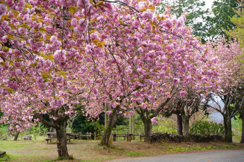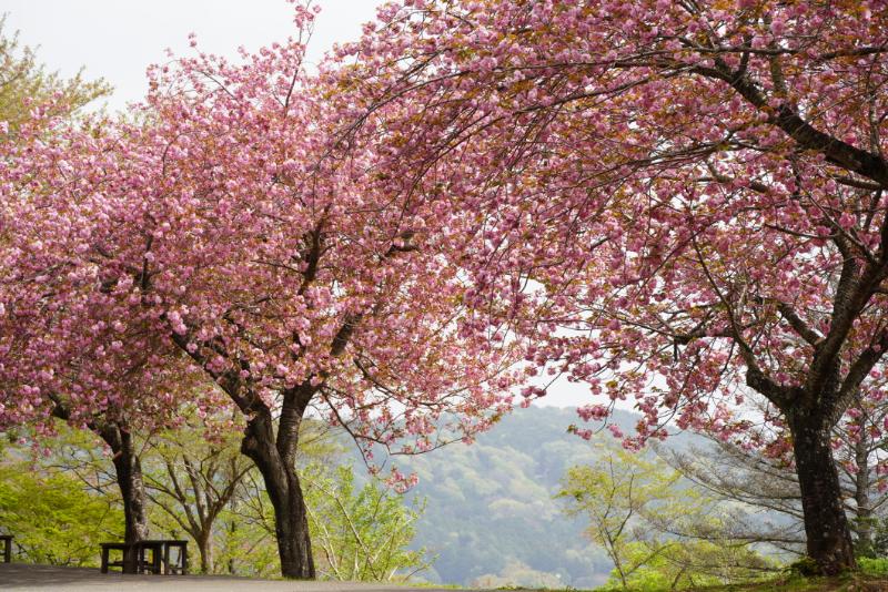 八重桜は花やさと山の山頂から周遊道路沿いを可愛いピンク色のお花で彩り、菜の花と筑波山とのコラボもお楽しみいただけます。