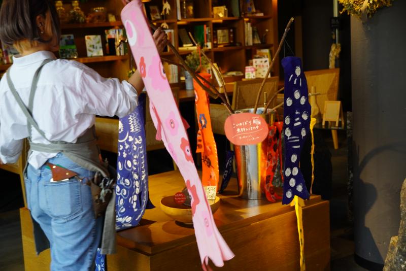 園内にたなびくこいのぼり。インフォメーションでは、撮影用アイテムとして、こいのぼりレンタルを行っています!