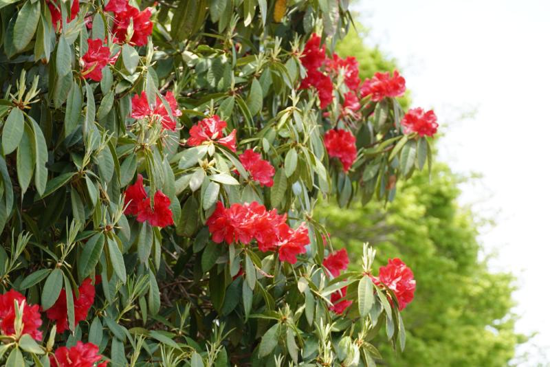 ムラサキハナナのバックに咲く西洋シャクナゲ