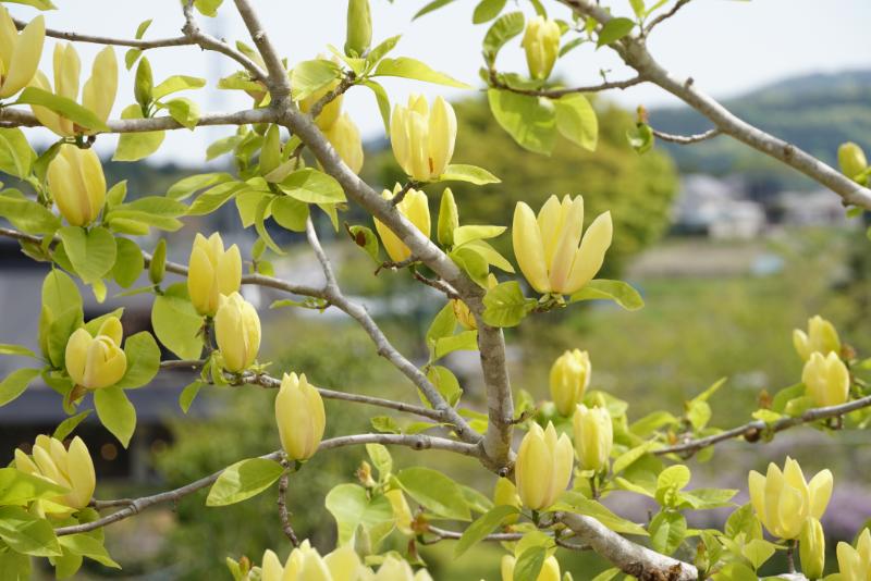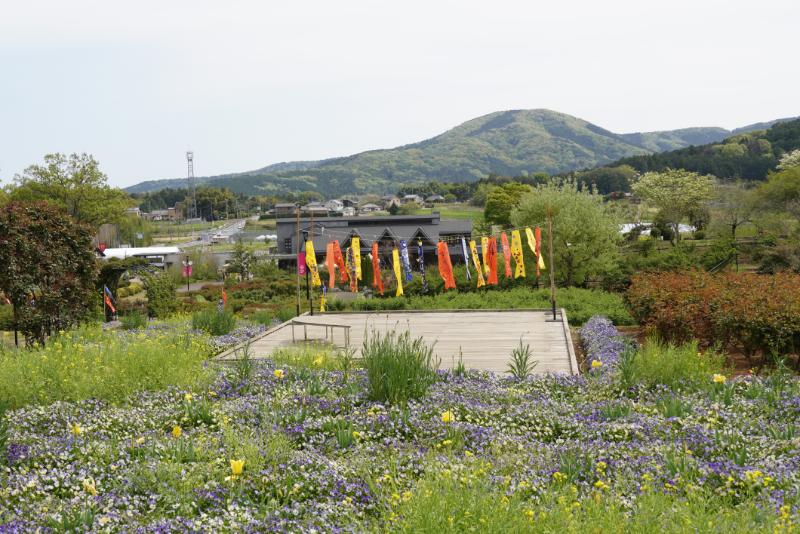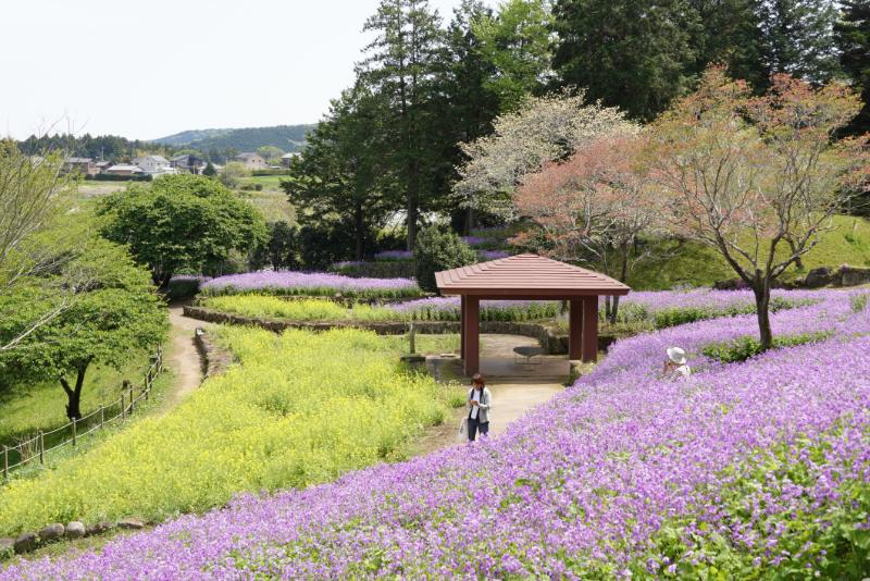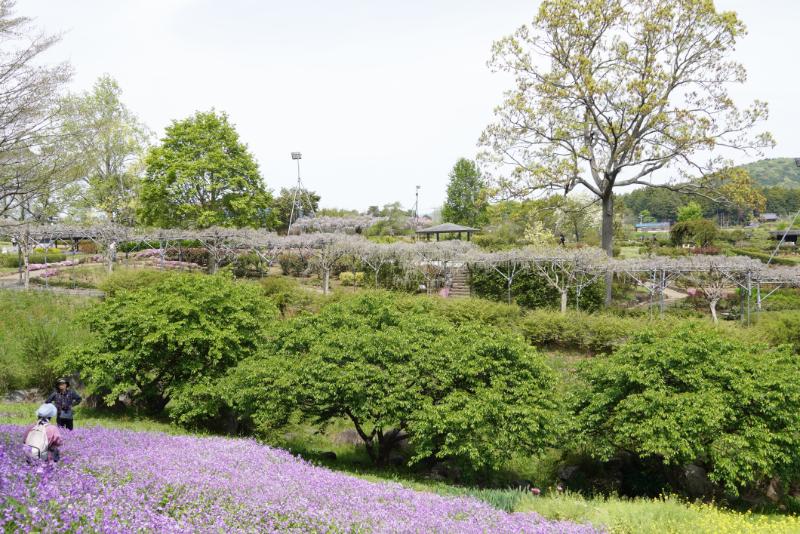 また園内では、ムラサキハナナや菜の花がやさしく風に揺れ、パンジーやシャガ、キモクレン、ヤマブキなど、多彩な花々が咲いています。