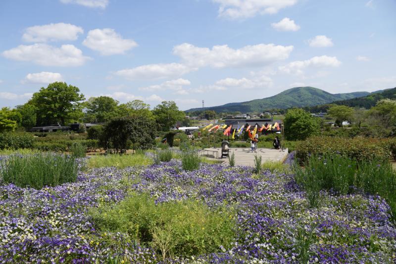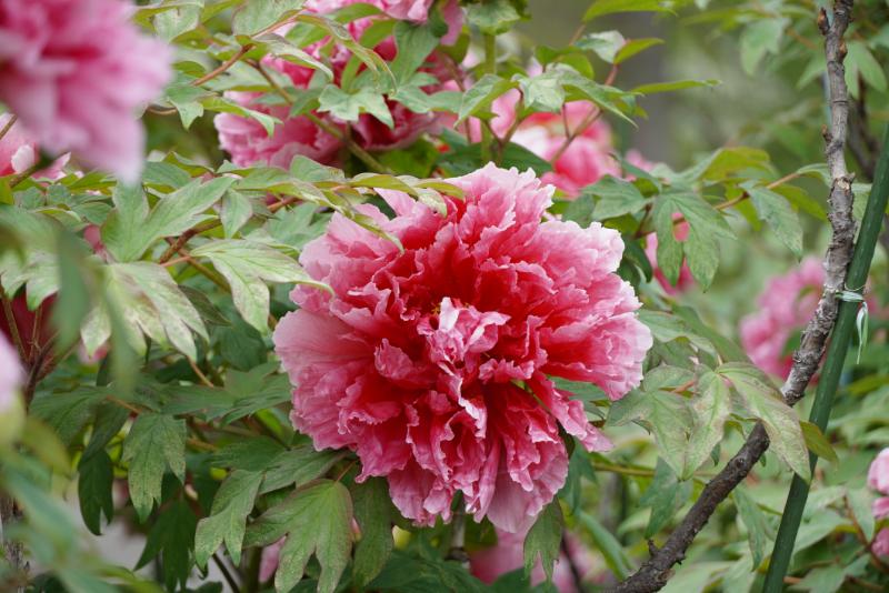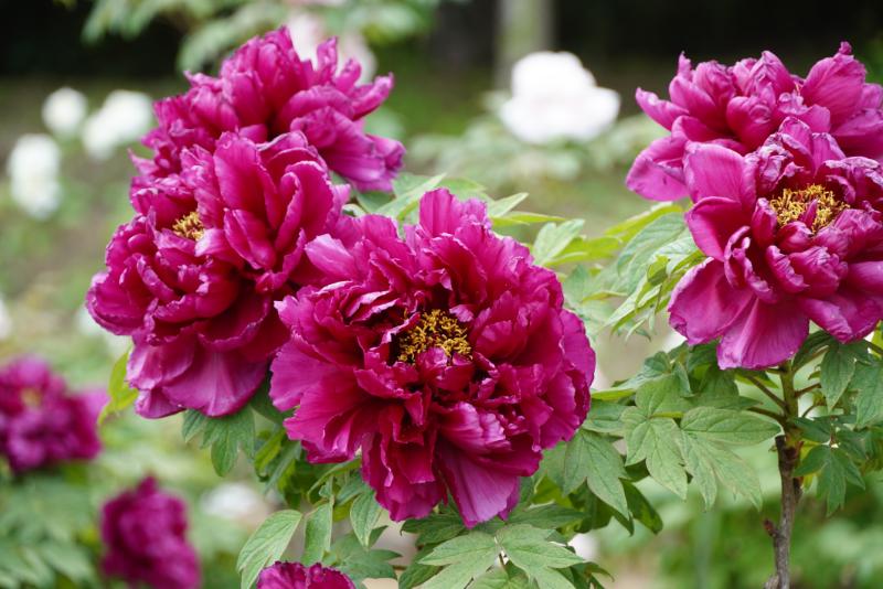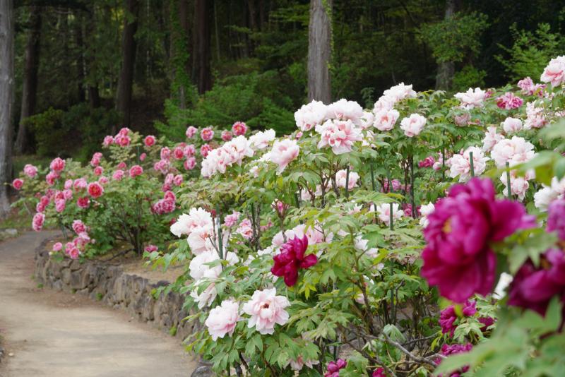 春の園内では、華やかなボタンが見頃を迎え、里山に彩り豊かな風景が広がっています。