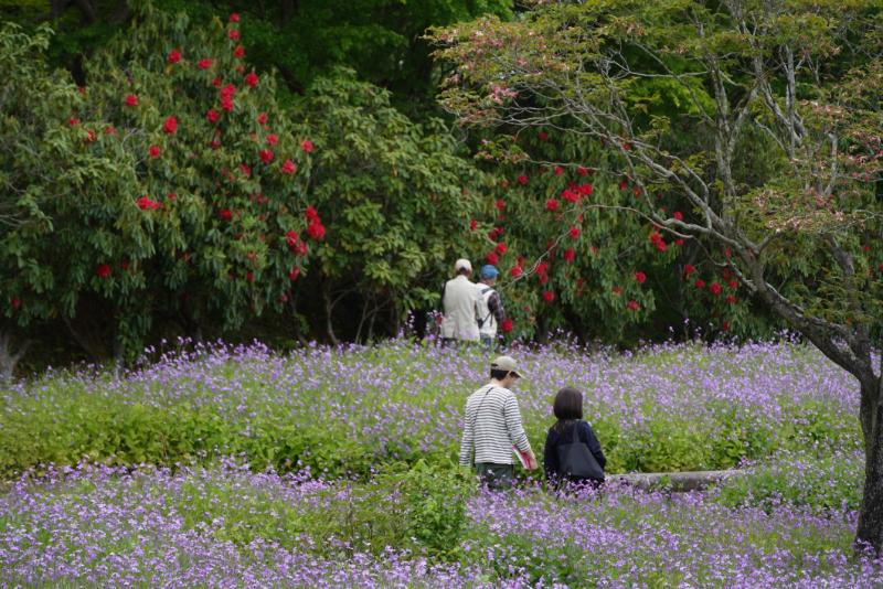ムラサキハナナとフジ。西洋シャクナゲも見頃です。