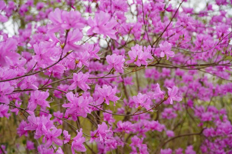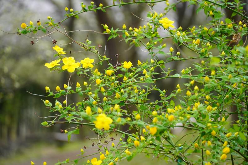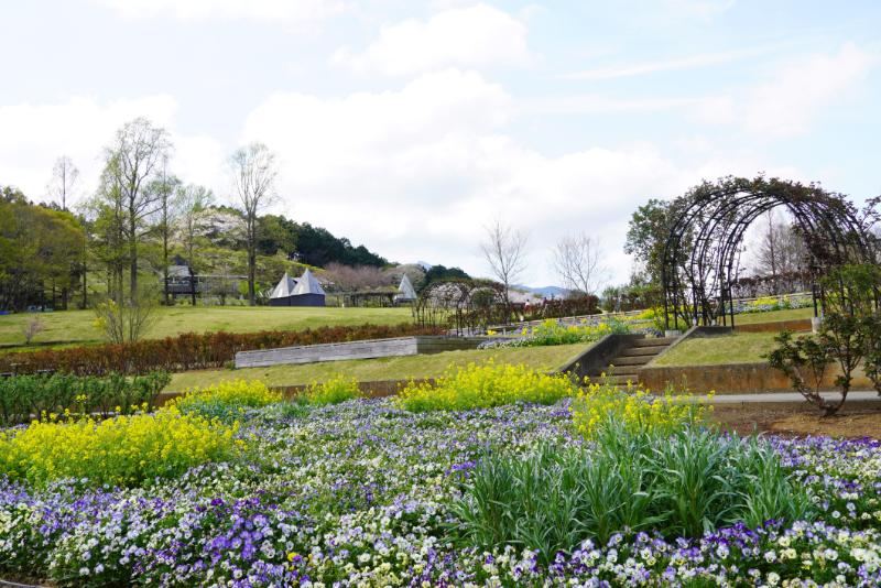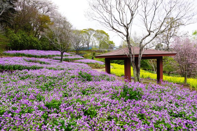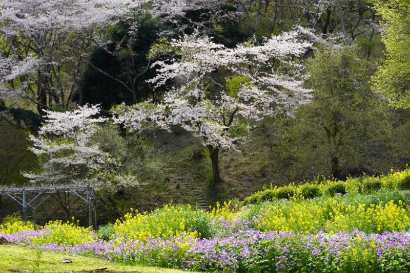 ムラサキハナナ、菜の花、ミツバツツジ、ヤマブキも咲いていて、日々色彩を増すフラワーパークです。
