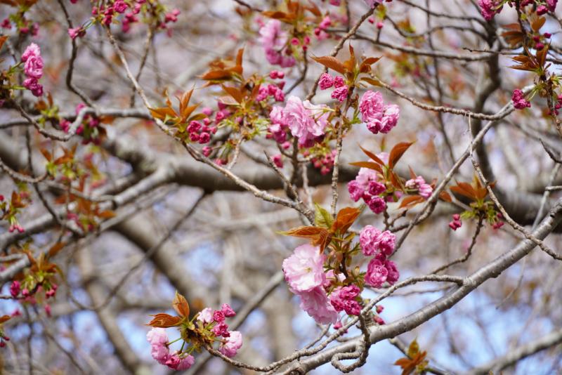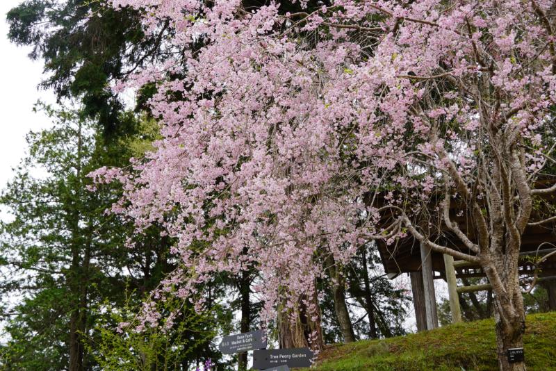池の近くでは枝垂れ桜が見頃で、山頂の八重桜は咲きはじめです。