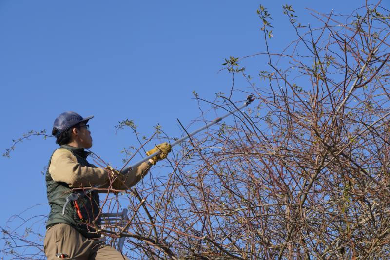 ハシゴと高枝ばさみを使って丁寧に剪定していきます。