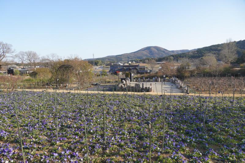 パンジーの咲く、冬晴れの青空が広がるバラテラスでは、芝桜が咲きはじめています。