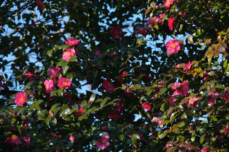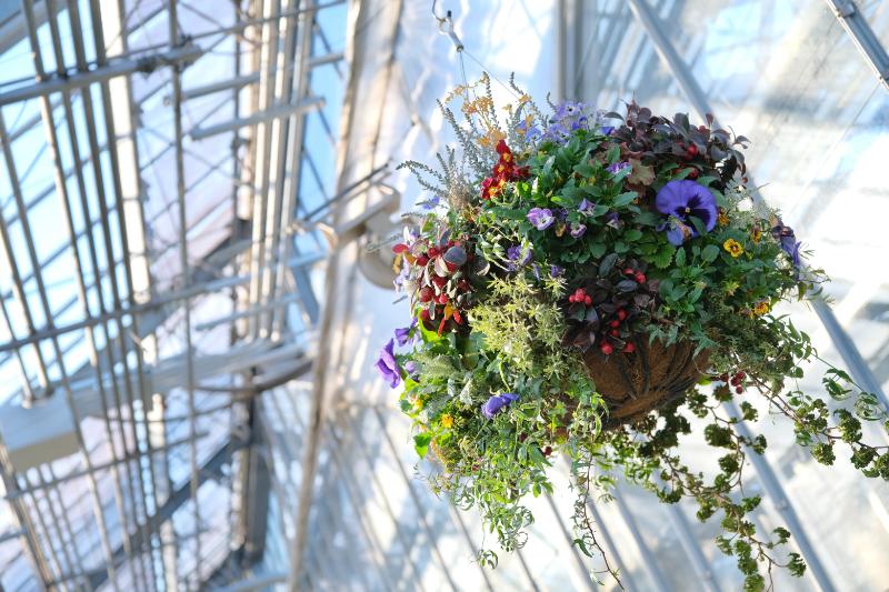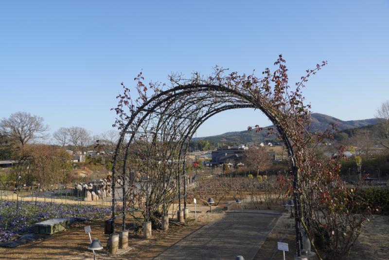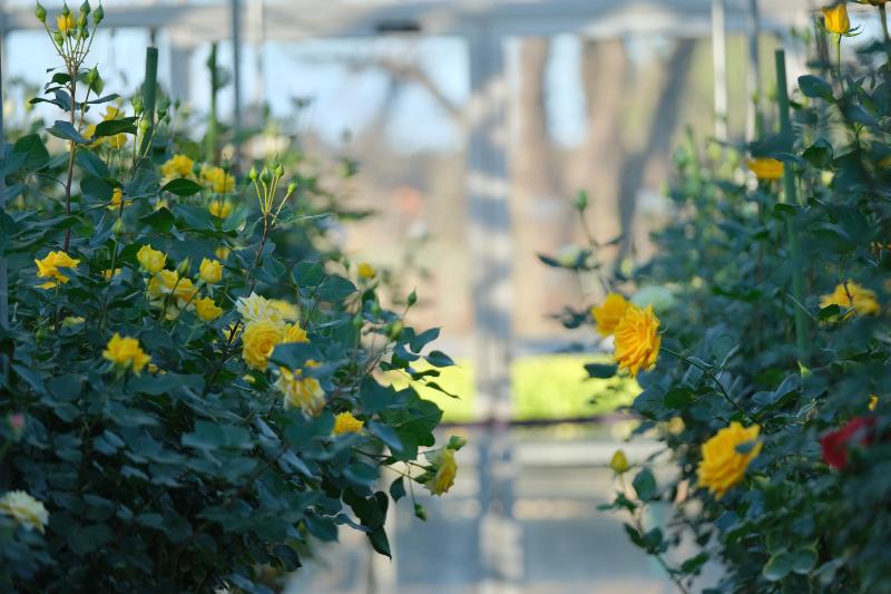そのほか、サザンカやロウバイなど冬の花が咲き、ハンギングフラワーが吊るされて「春待つ温室」の準備が進むアトリエの温室内では、バラを見ることができます。