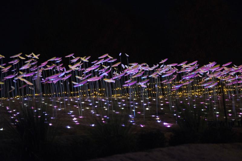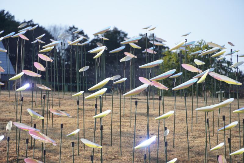 昼はグリーンヒルで、太陽を浴びてキラキラと輝く「風の花びら」は、夜はライトアップされて幻想的な表情に変わります。