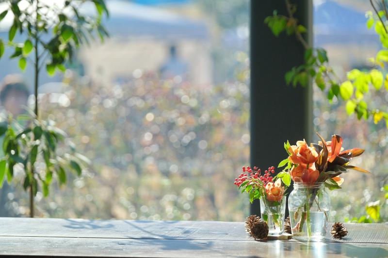 カフェのテーブルのお花も冬仕様