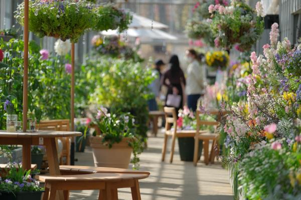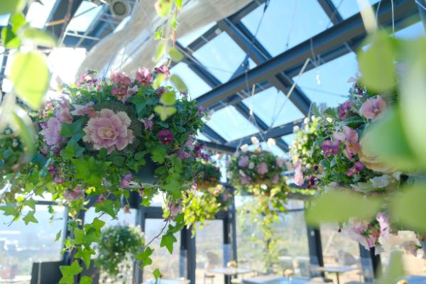 カラフルなハンギングフラワーや鳥の巣が吊るされ、芽吹き始めた花々が温室を彩ります。