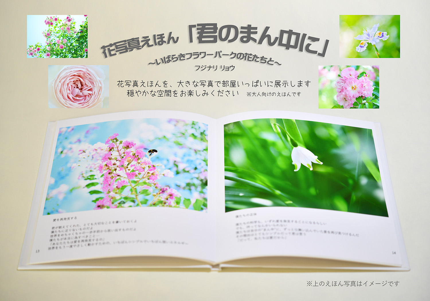 アトリエ内では、いばらきフラワーパークで撮影された写真によるフジナリ リョウ花写真えほん展も同時開催します。