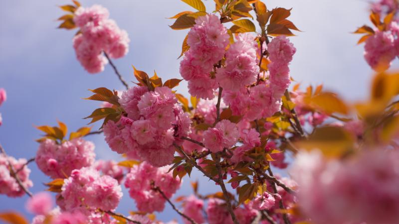 今朝はあいにくの空模様でしたが、濃いピンク色でとっても華やかな八重桜!