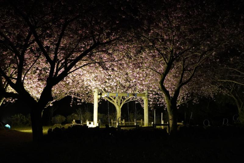 グランピング施設のある花やさと山では、来週末まで、週末限定で八重桜ライトアップを実施中!お花見ブランコが楽しめます!