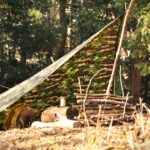 【午前】ひと休みしたり食事をとったりできる、自分たちの「拠点」づくり。四角い布のスクエアタープとロープ、落ち枝などを用いて、素敵な秘密基地を作り上げます。