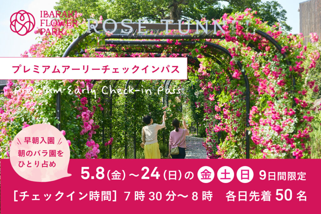 春バラが見頃を迎える2026年5月8日(金)~10日(日)、15日(金)~17日(日)、22日(金)~24日(日)の9日間限定、各日先着50名様に早朝入園いただける「プレミアムアーリーチェックインパス」をアソビュー電子チケットにて販売します。