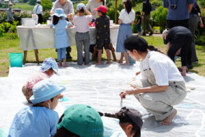 絵本作家・小林由季氏と一緒に、自然の中で大きな透明ビニールに絵の具で絵を描くワークショップ。