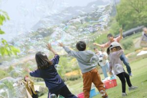 シャボン男爵による青空の下でたくさんのシャボン玉を飛ばすショー。子どもたちと一緒にシャボン玉を飛ばす体験会も実施。