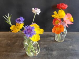 バラテラスに咲くヤグルマギクやポピーなどを摘んで、ハンギングボトルに入れてお持ち帰り。