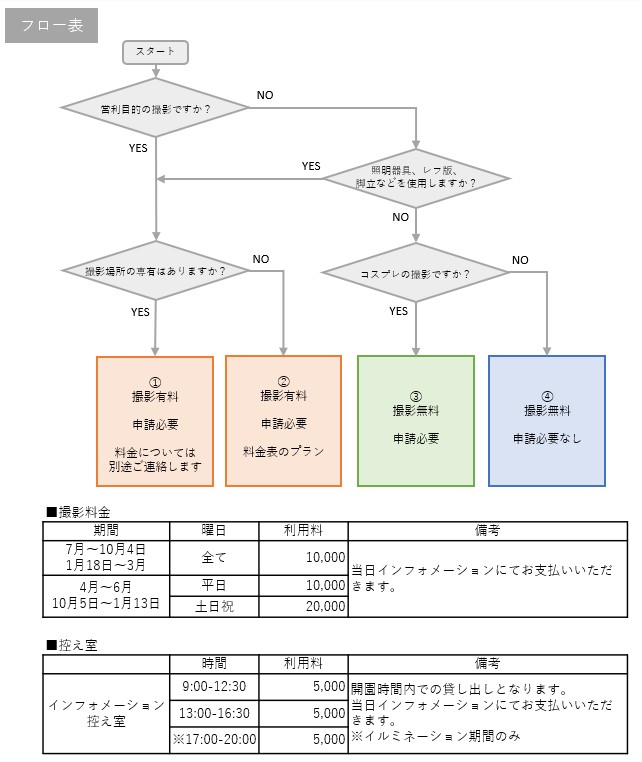 - 営利目的での撮影の場合は撮影有料となりますので申請が必要です。