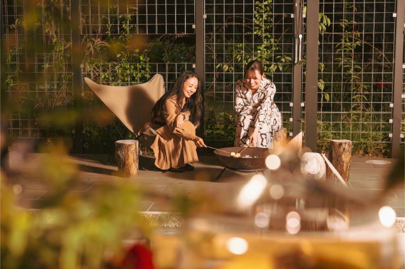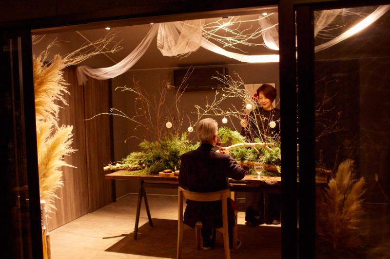 花にふれるフローリストとのアクティビティを楽しんだ後、幻想的な灯りに包まれるプライベート空間で美食を味わい、焚き火に癒される。