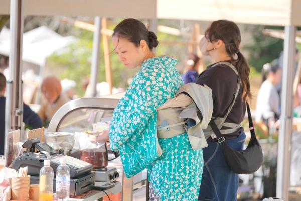 華やかな着物で販売するスタッフ