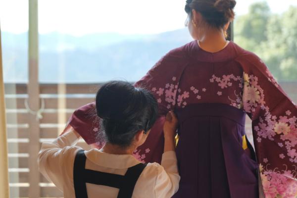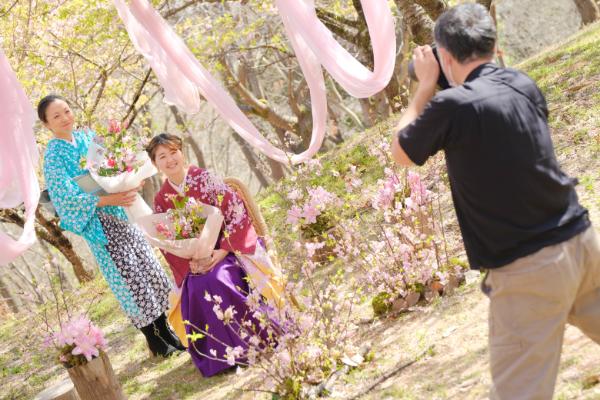 サークルロッジでは着付けを実施。桜に映える着物や袴