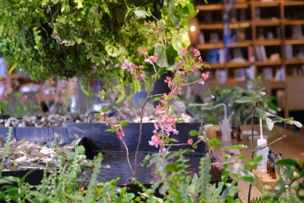 桜が活けられたインフォメーションでは、桜のアロマミストづくりも行われました。