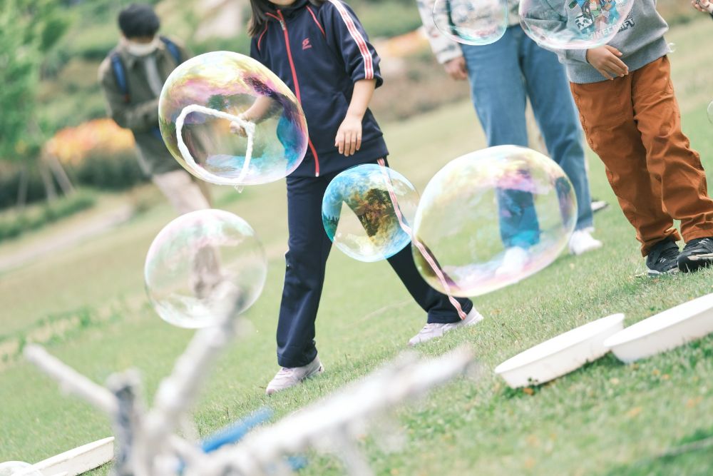 ショーの間、たくさんのお子さんが夢中でしゃぼん玉を追いかけ、芝生を元気に走り回りながら全身でキラキラを浴びていました。
